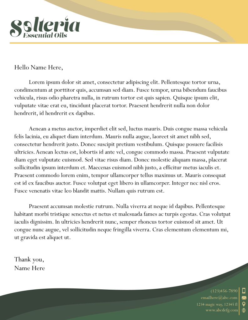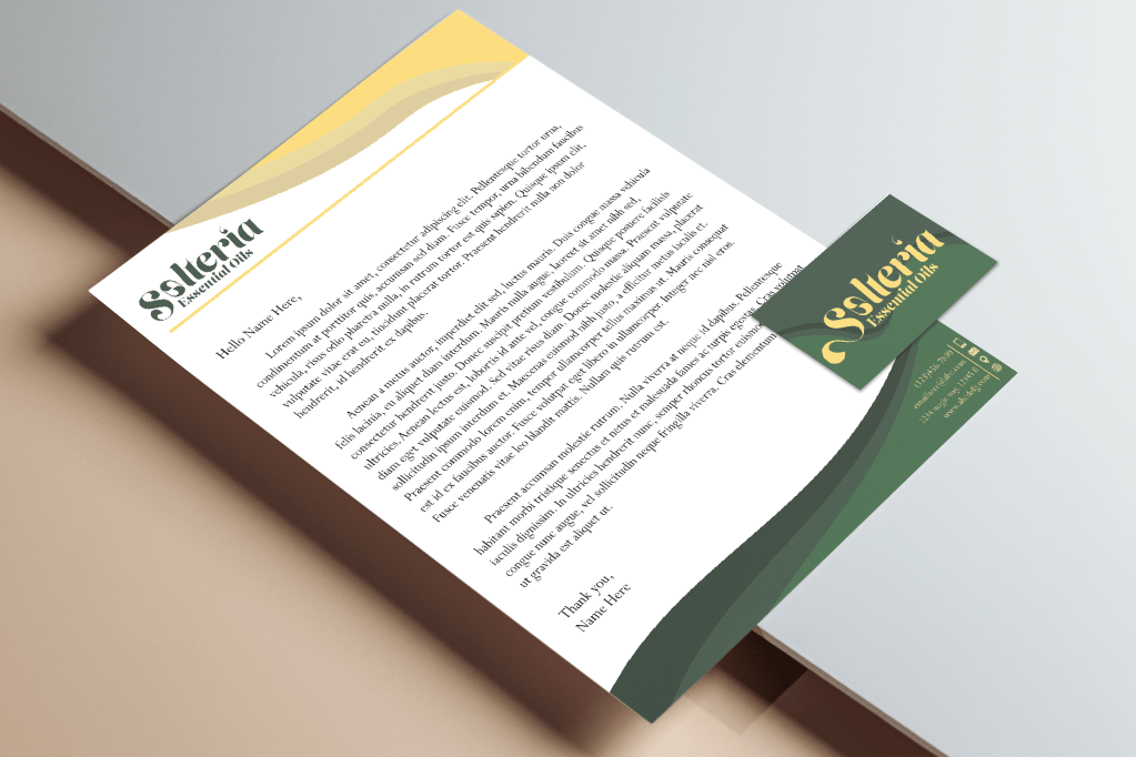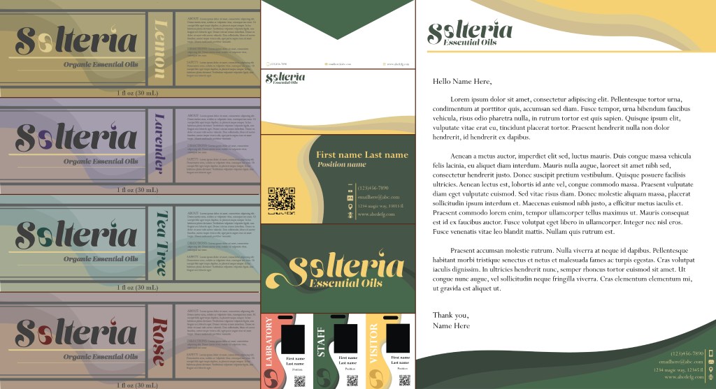 Solteria, an essential oils company that specializes in producing high-quality, natural essential oils. The company’s core identity revolves around the concepts of carefree, nature, and wellness. The primary brand colors are green and yellow, which reflect the company’s commitment to natural products and vibrant well-being.