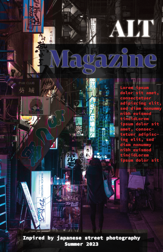 Since each magazine is different this would be the generalized process. The overall look takes the idea of elevating alternative fashion into the style of vouge. Other alternative fashion magazine is visually stimulating but often about individual bands/people not actually design.