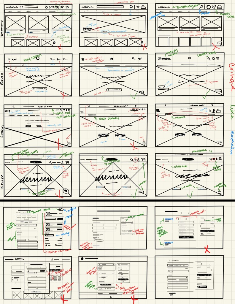 As stated in the planning stage the original wireframed based on the independent research before receiving the survey was all done on paper. This process was quantity over quality to start establishing and working through the best iterations quickly