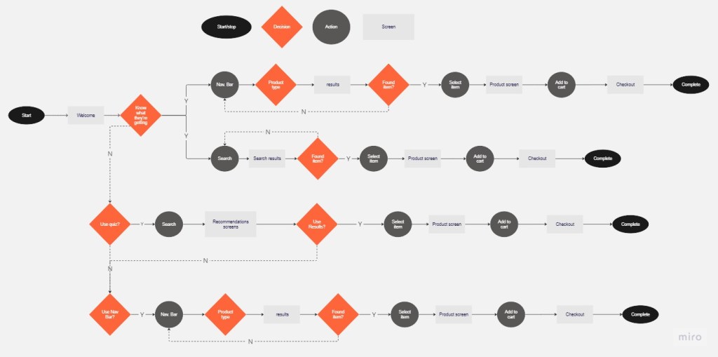 The initial planning was happening in conjunction with research. Creating a user flow and establishing expectations for a task flow, ensured that the end product had a solid end goal.